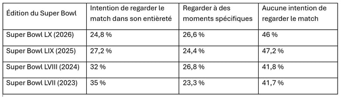 L'enquête révèle aussi que seulement 24,8% des répondantes et répondants ont l'intention de regarder le match dans son entièreté, le plus bas niveau enregistré depuis la première édition du Baromètre sur le Super Bowl publiée en 2023: